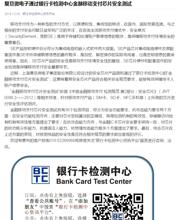 復(fù)旦微電子芯片通過銀行卡檢測(cè)中心金融移動(dòng)支付芯片安全測(cè)試