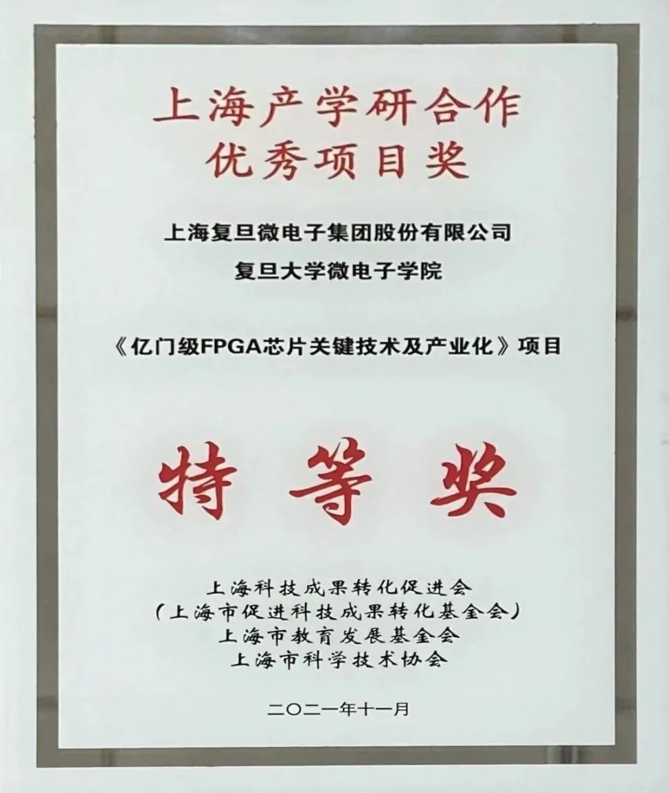 經(jīng)過前期的推薦申報、專家評審和社會公示,經(jīng)上??萍汲晒D化促進會、上海市教育發(fā)展基金會、上海市科學技術協(xié)會審定批準,授予上海復旦微電子集團股份有限公司、復旦大學微電子學院的合作項目《億門級FPGA芯片關鍵技術及產(chǎn)業(yè)化》2021年上海產(chǎn)學研合作優(yōu)秀項目獎特等獎。