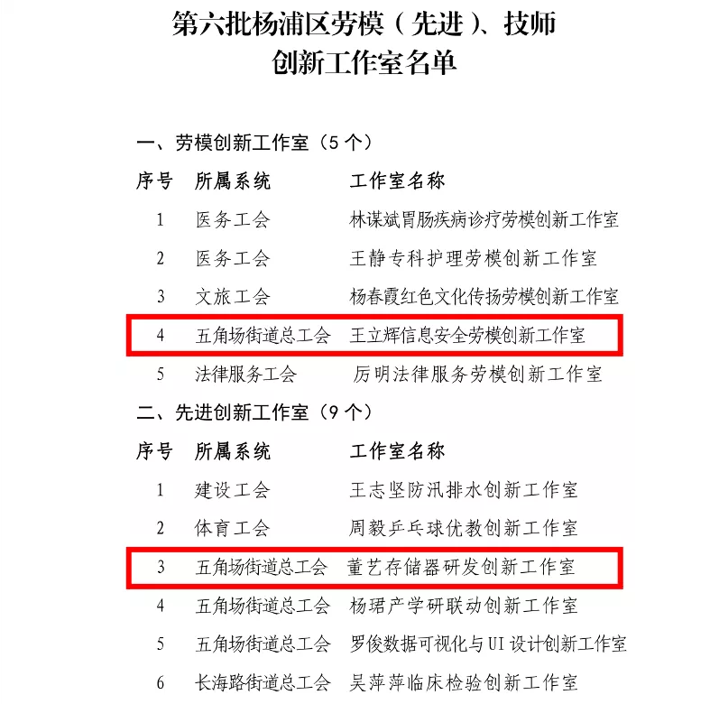 近日,楊浦區(qū)總工會(huì)發(fā)布《關(guān)于命名第六批楊浦區(qū)勞模(先進(jìn))、技師創(chuàng)新工作室的決定》。復(fù)旦微電子集團(tuán)“王立輝信息安全勞模創(chuàng)新工作室”被命名為“楊浦區(qū)勞模創(chuàng)新工作室”,“董藝存儲(chǔ)器研發(fā)先進(jìn)創(chuàng)新工作室”被命名為“楊浦區(qū)先進(jìn)創(chuàng)新工作室”。