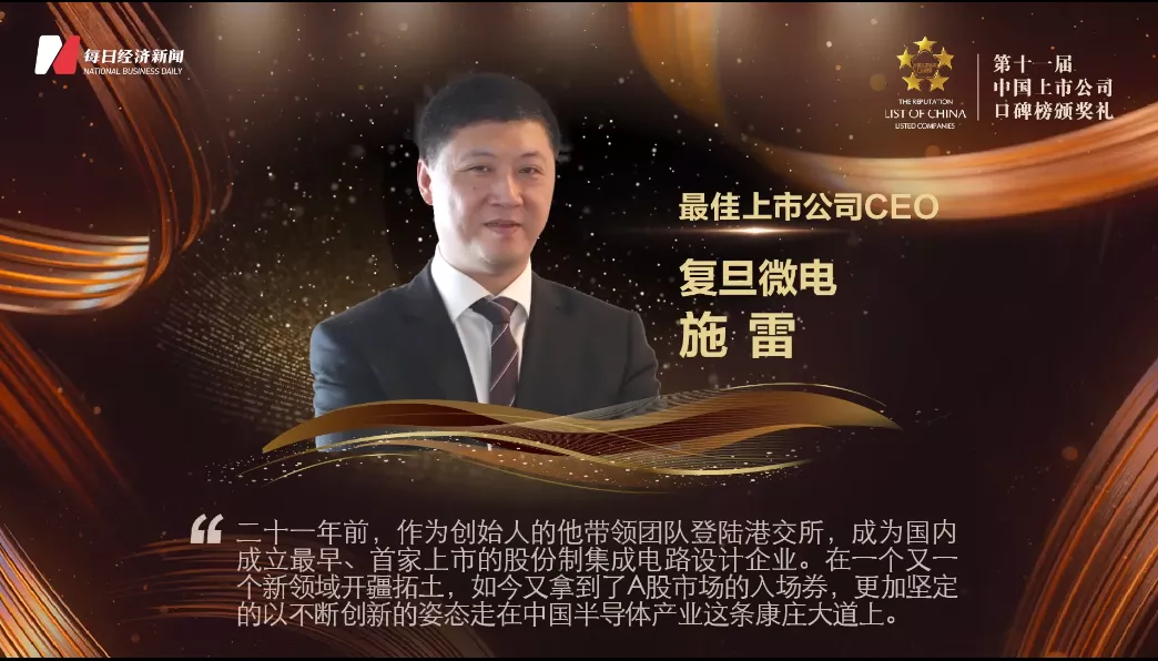 憑借多年在半導(dǎo)體行業(yè)的深厚耕耘以及帶領(lǐng)企業(yè)發(fā)展壯大的卓越領(lǐng)導(dǎo)力,上海復(fù)旦微電子集團股份有限公司CEO施雷榮獲“第十一屆中國上市公司口碑榜——最佳上市公司CEO”。