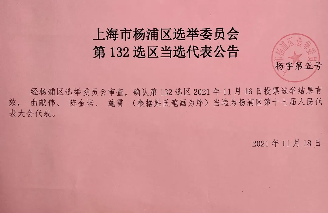 經(jīng)楊浦區(qū)選舉委員會(huì)審查,確認(rèn)第132選區(qū)2021年11月16日投票選舉結(jié)果有效,上海復(fù)旦微電子集團(tuán)股份有限公司董事總經(jīng)理施雷當(dāng)選為楊浦區(qū)第十七屆人民代表大會(huì)代表。